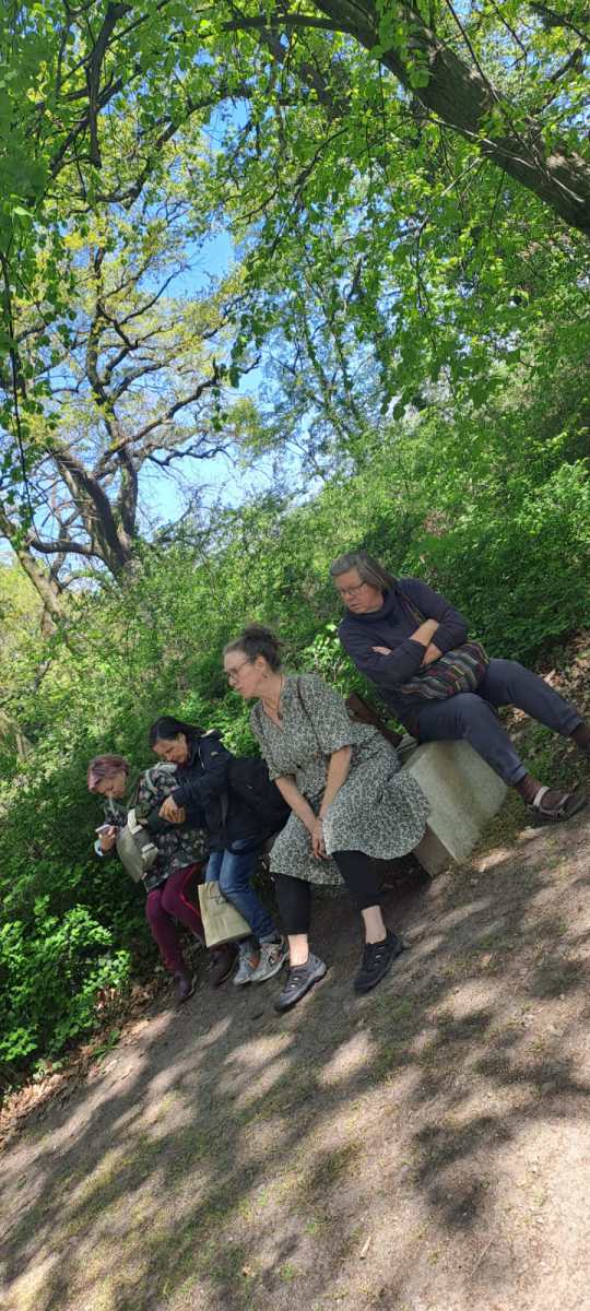 …die vier Kräuterneugierigen lauschend bei der Kräuterstunde…