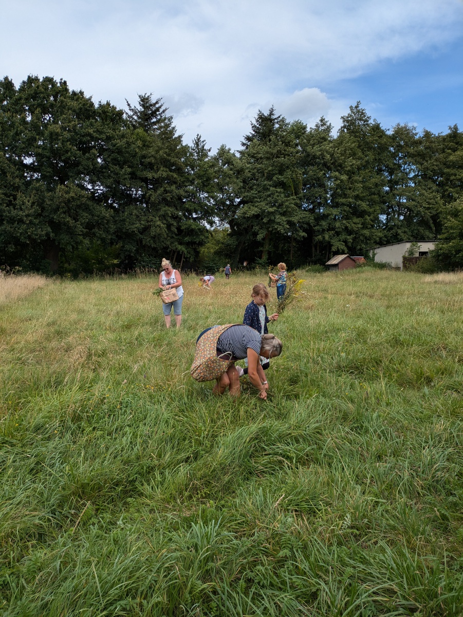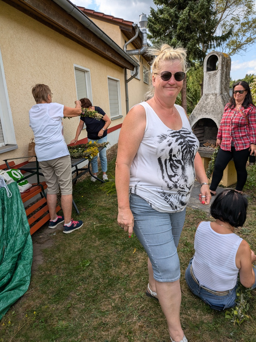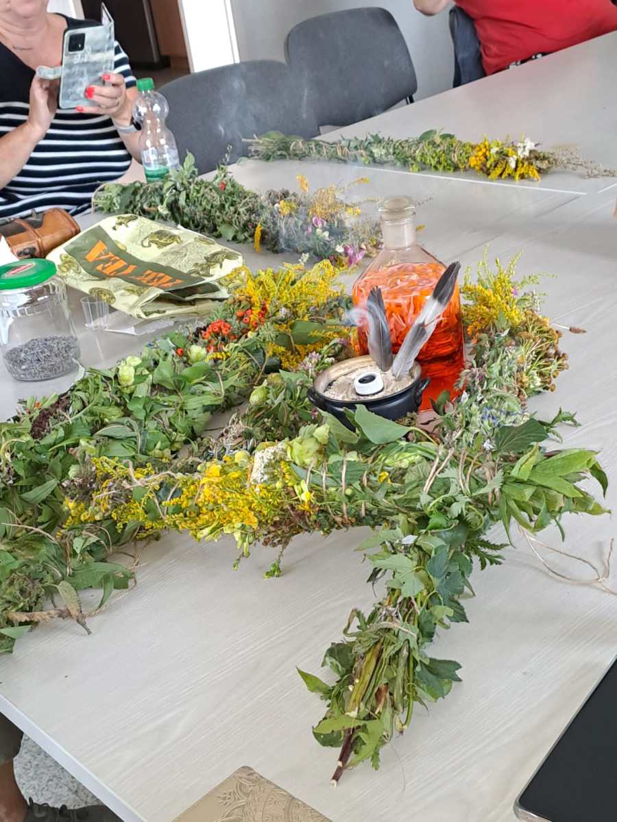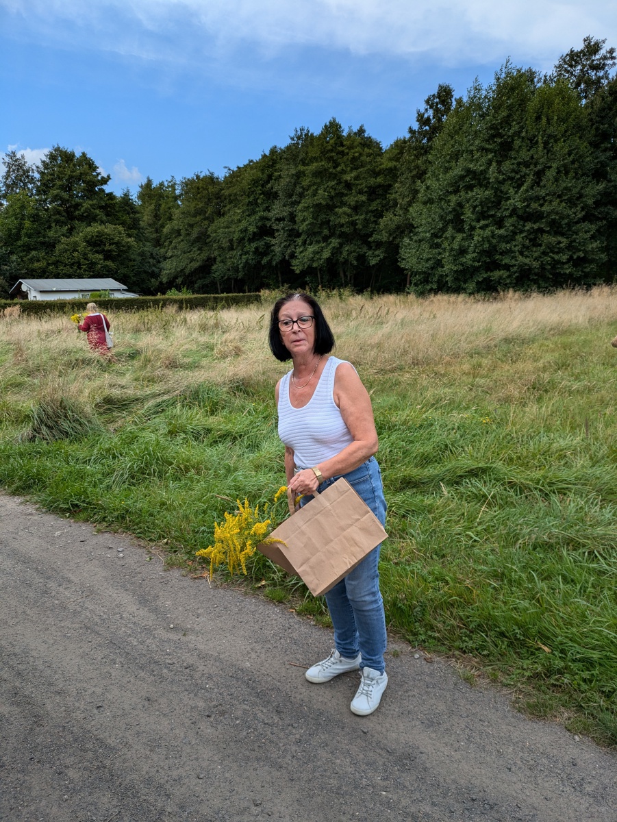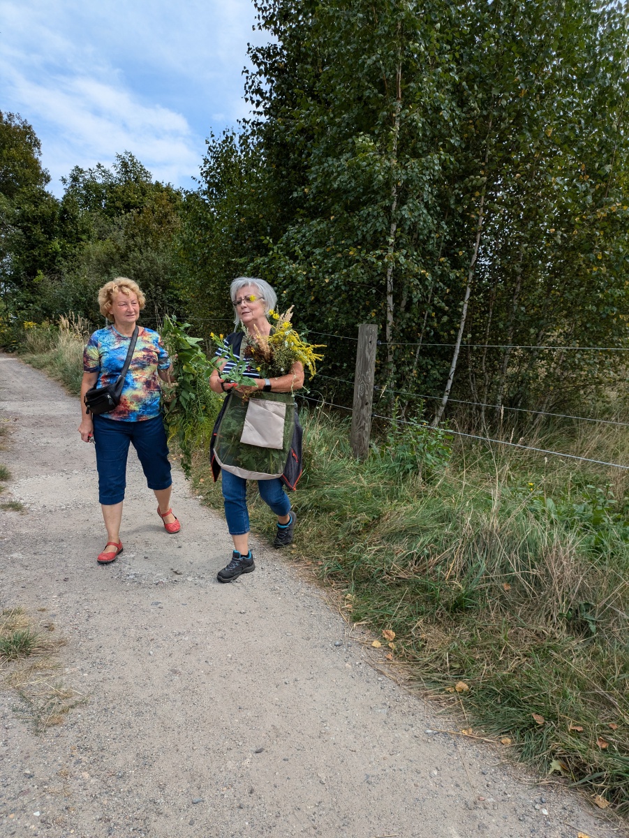 Die Götter hatten ein Einsehen und wir gingen bei angenehmen Sommertemperaturen, einer leichten Brise und auch ab und eine Wolken in die Kräuter. heute ging es einfach ums Sammeln. Jeder nahm die Wildkräuter seines Herzens für das Binden des "Hexenbesen" mit. Später saßen wir wieder zusammen, jeder band sich seine Kräuter mit Naturgarn in Vorbereitung auf unsere Abschlußrunde Ende September. Wunderschön und voller Freude, vielen ihr Lieben!!!